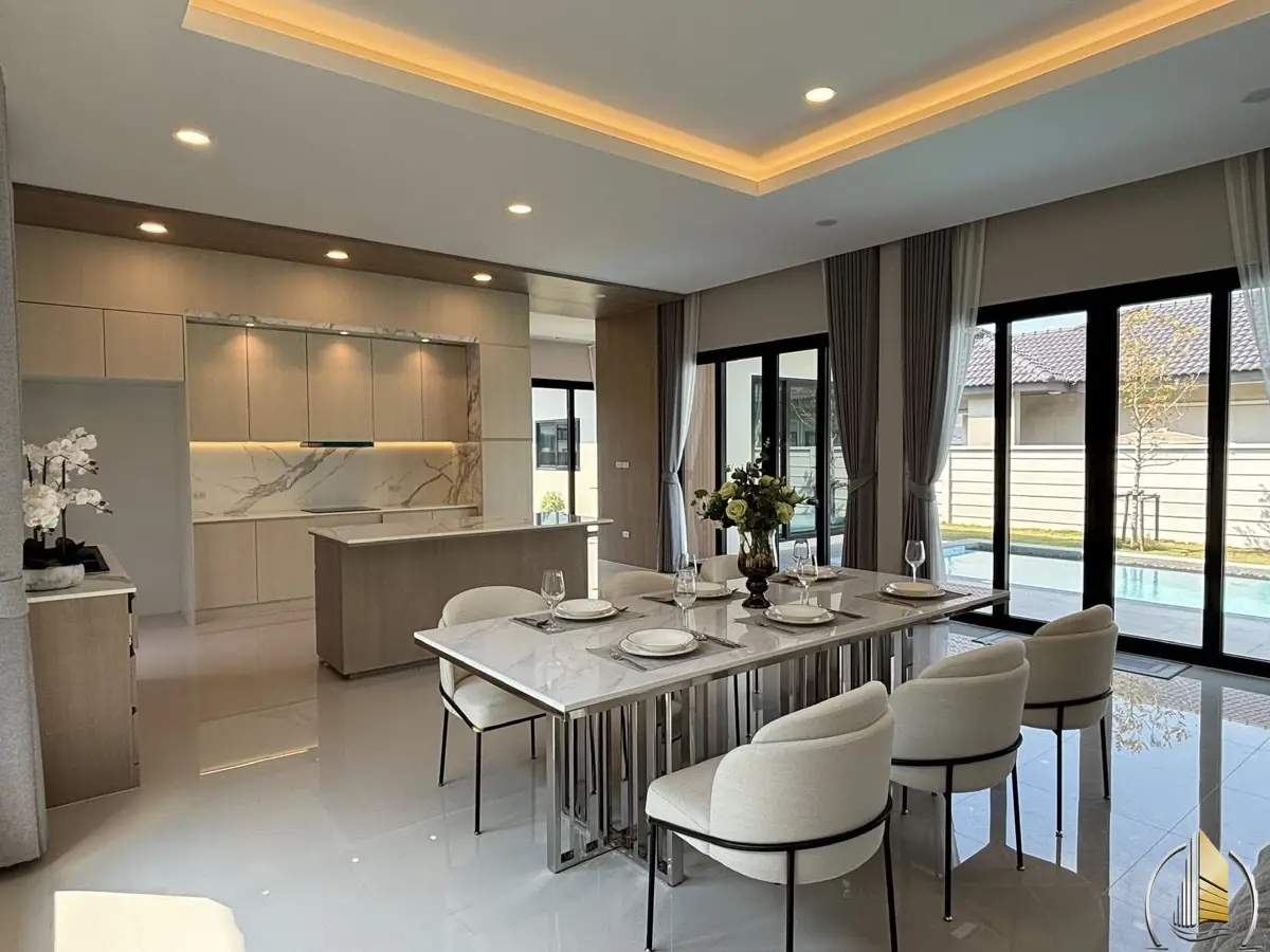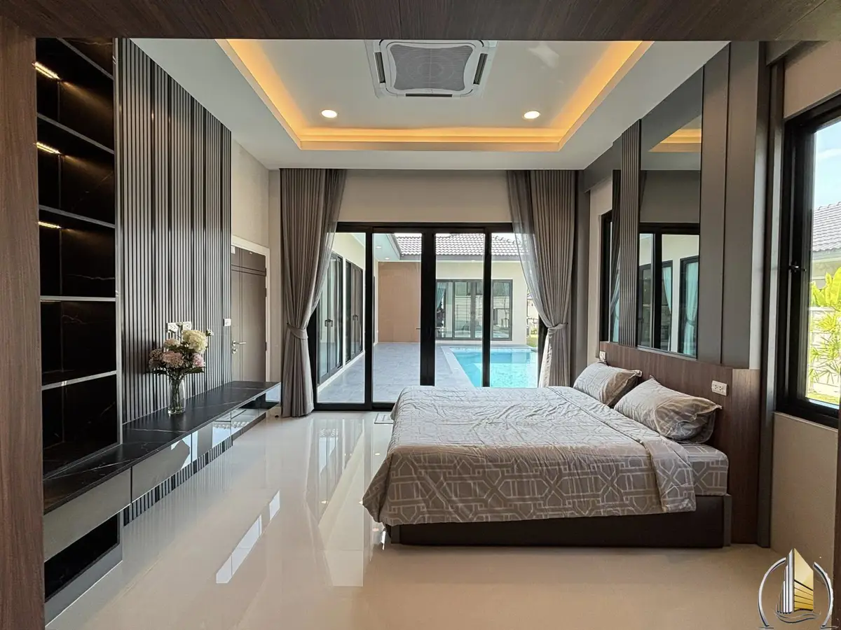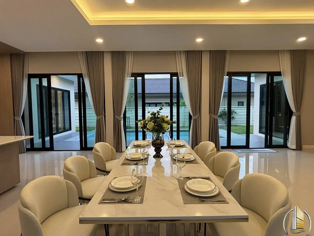 The property sits on a generous land plot of approximately 540 square meters (135 square wah) and is designed as a modern pool villa with spacious and functional living areas. The house features three large bedrooms, providing comfortable accommodation for families, along with four well-appointed bathrooms that ensure convenience for both residents and guests.