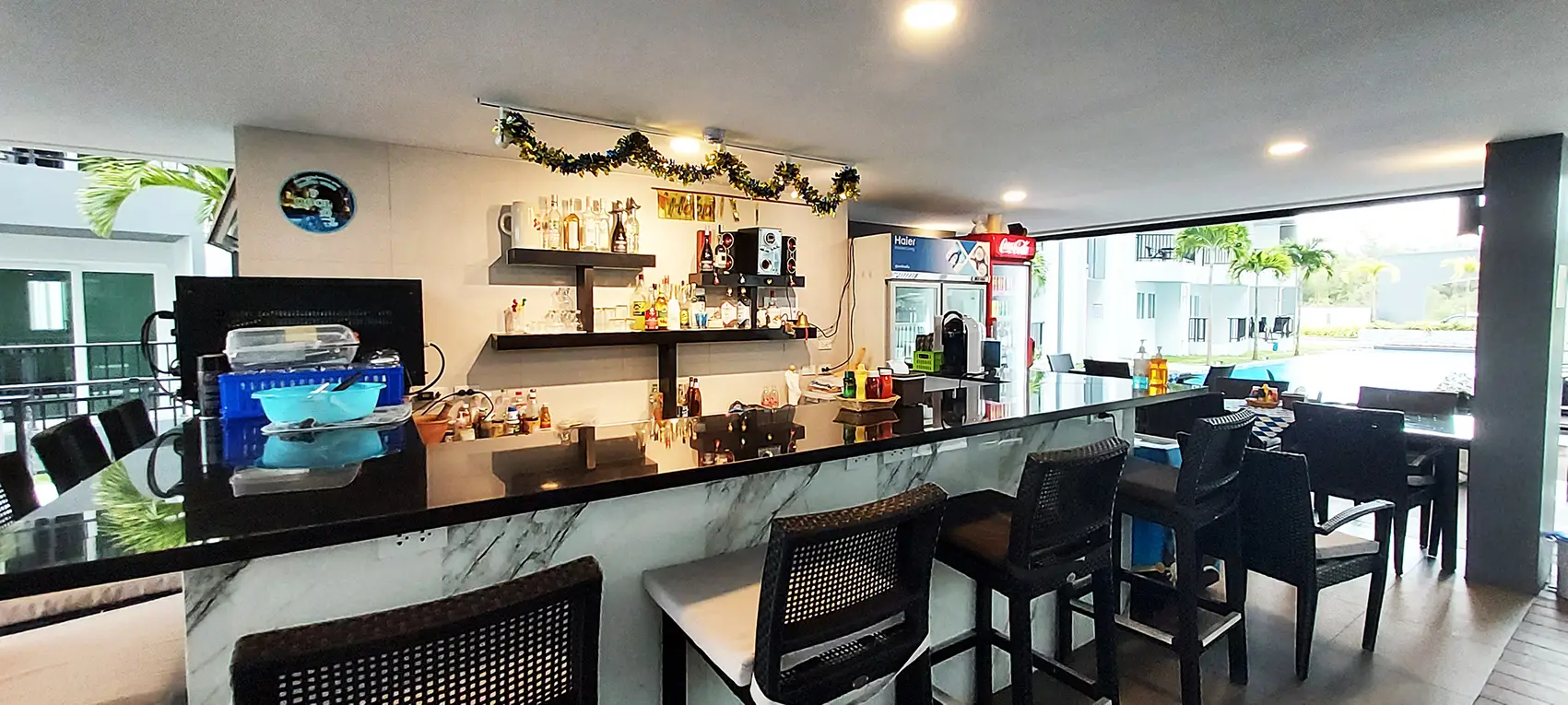The condominium has 2 pools, a main pool and a relax pool, with associated pool deck. By the pools there is a combined restaurant and bar. There is also a barbecue area for private parties, as well as a fitness center.