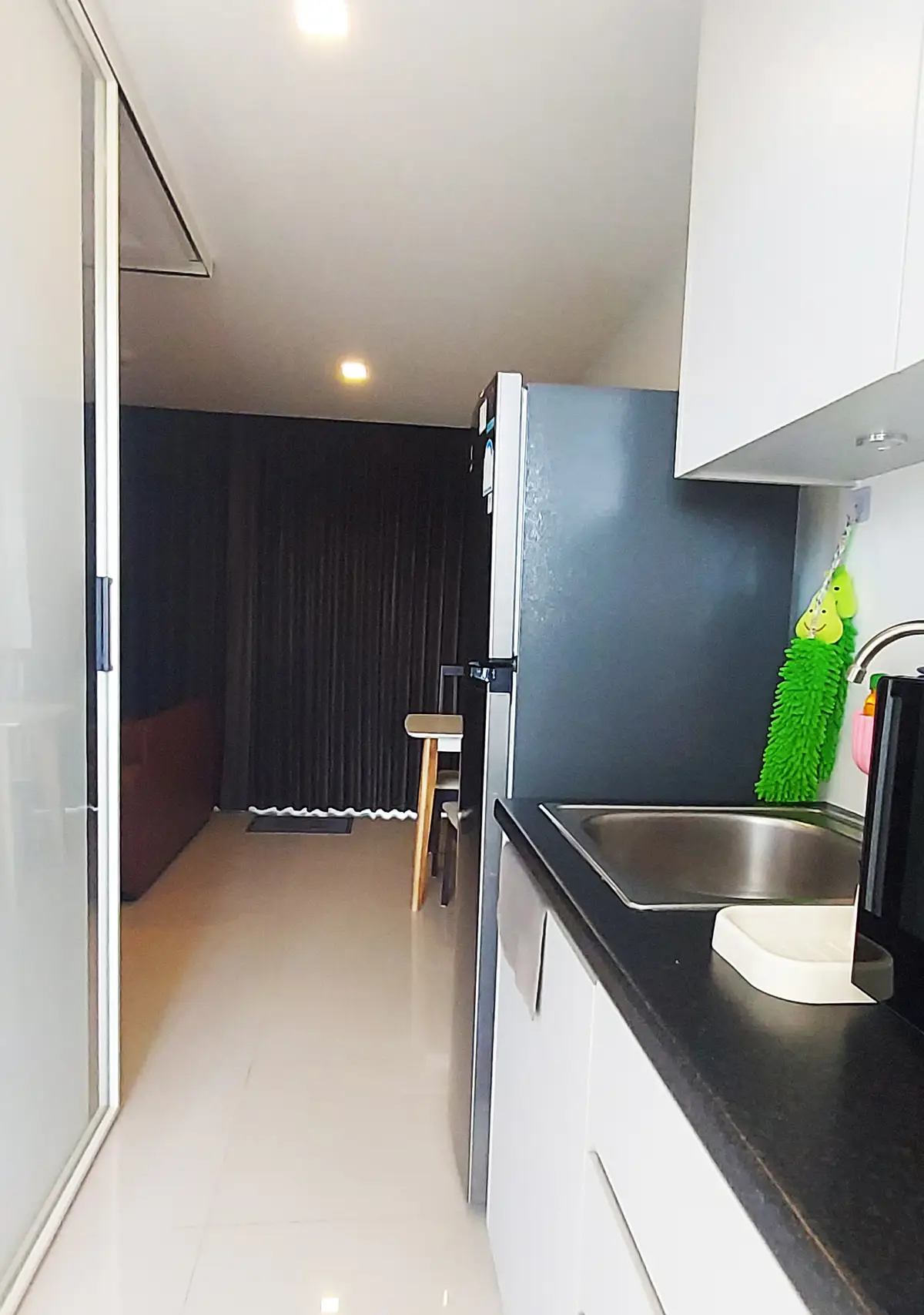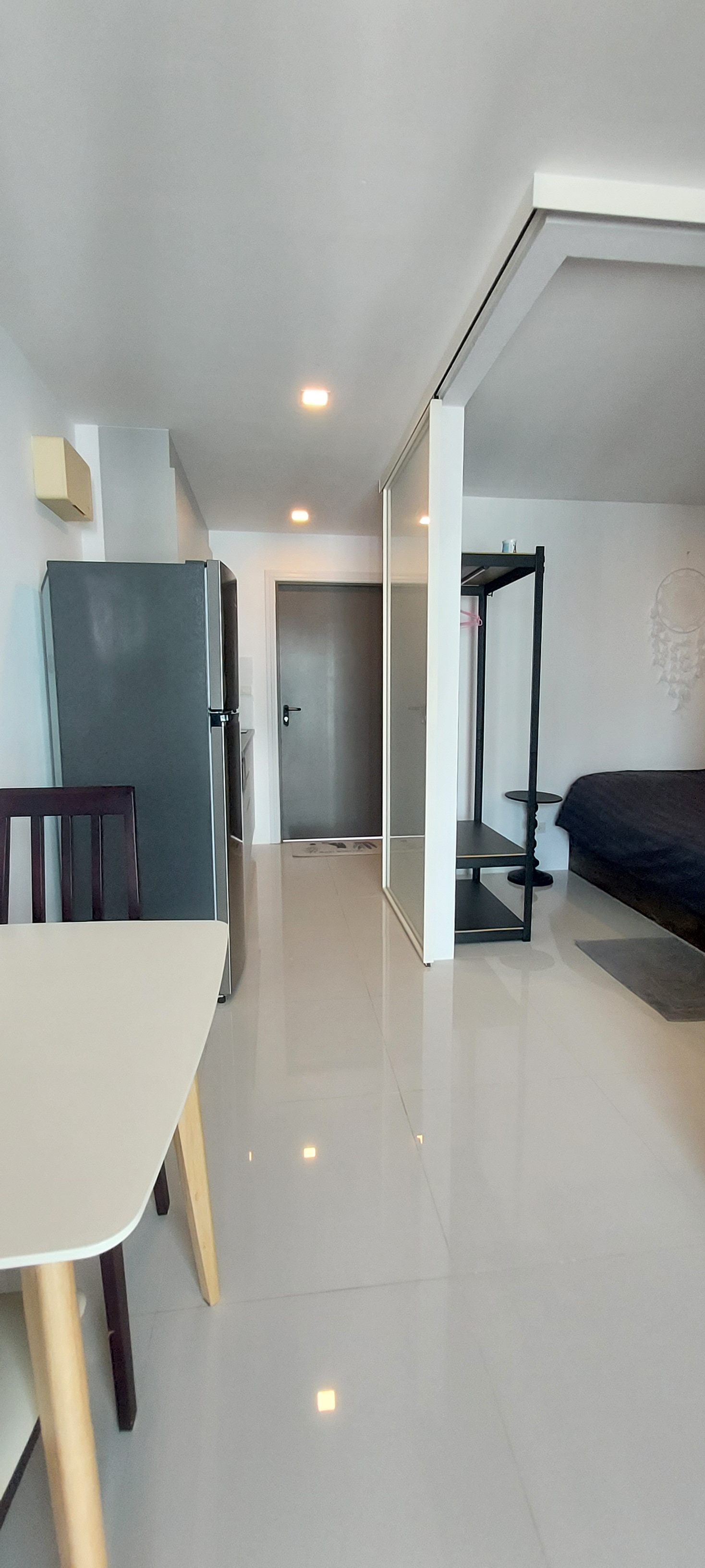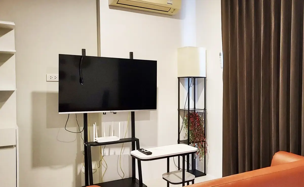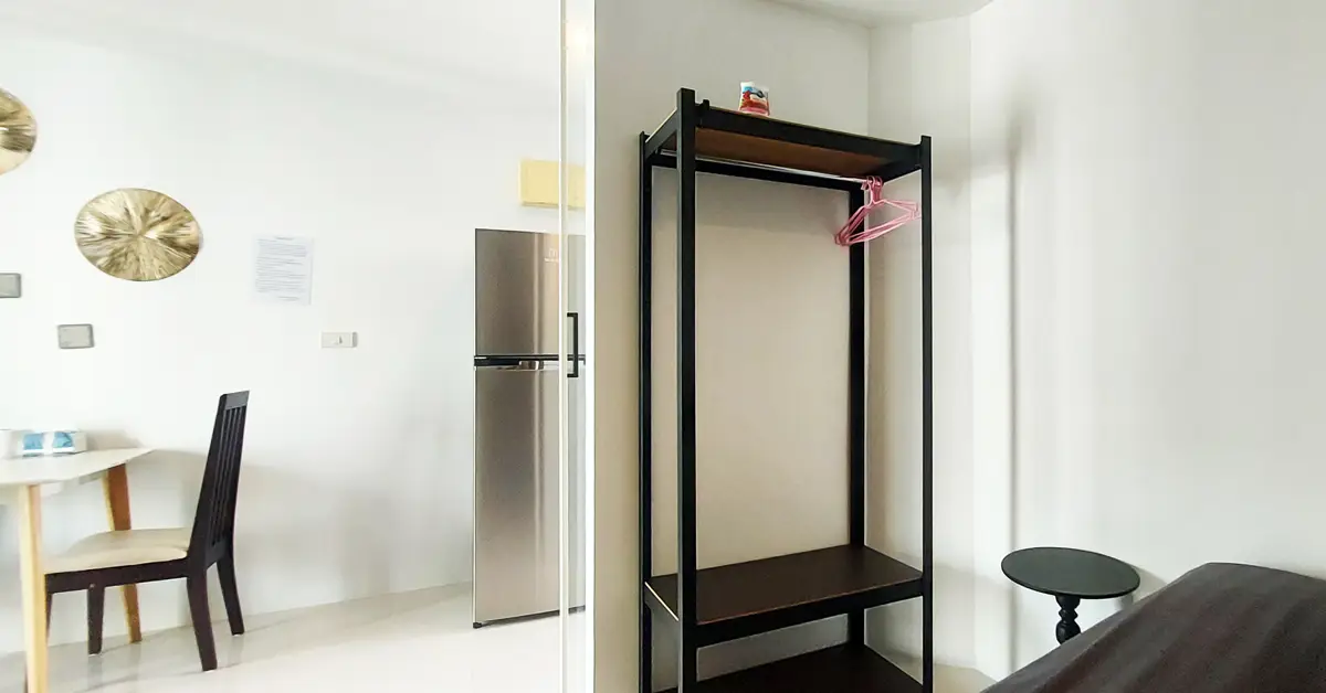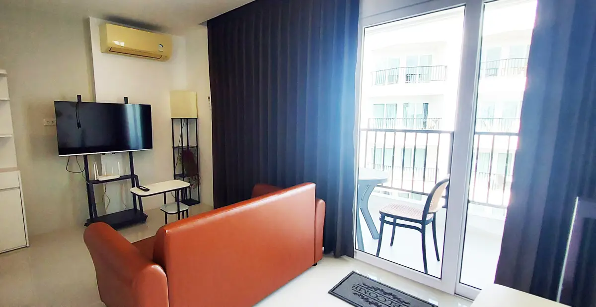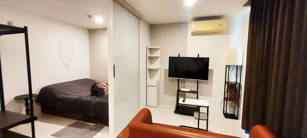 This condo on floor 7 has a living area of 32.32 square meters with a bedroom, a fully tiled bathroom, a living room and a kitchen area. The bedroom has two sliding walls/doors. Both the bedroom and the living room have air conditioning.