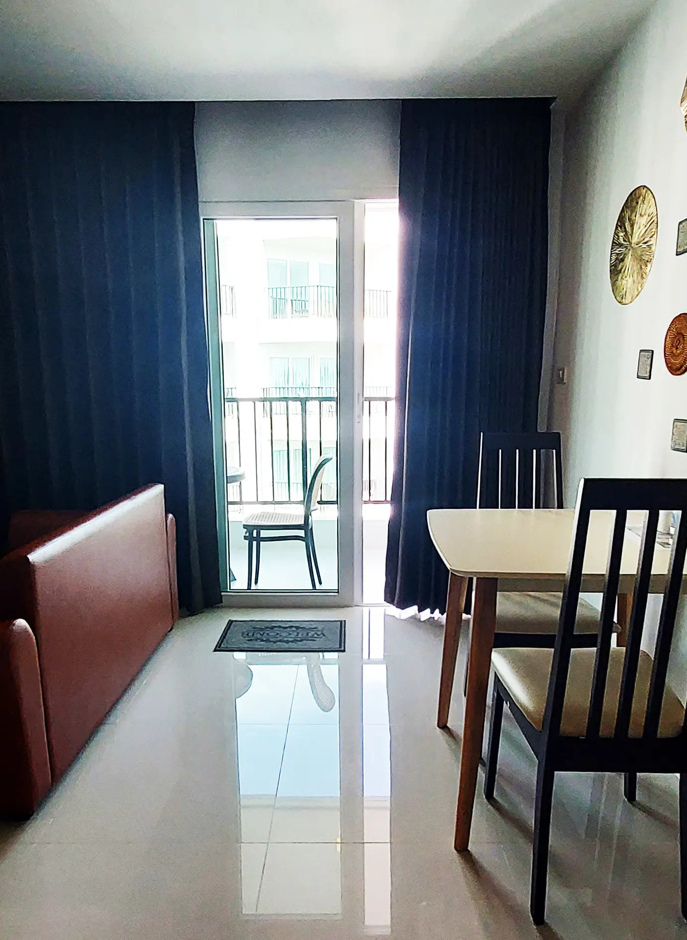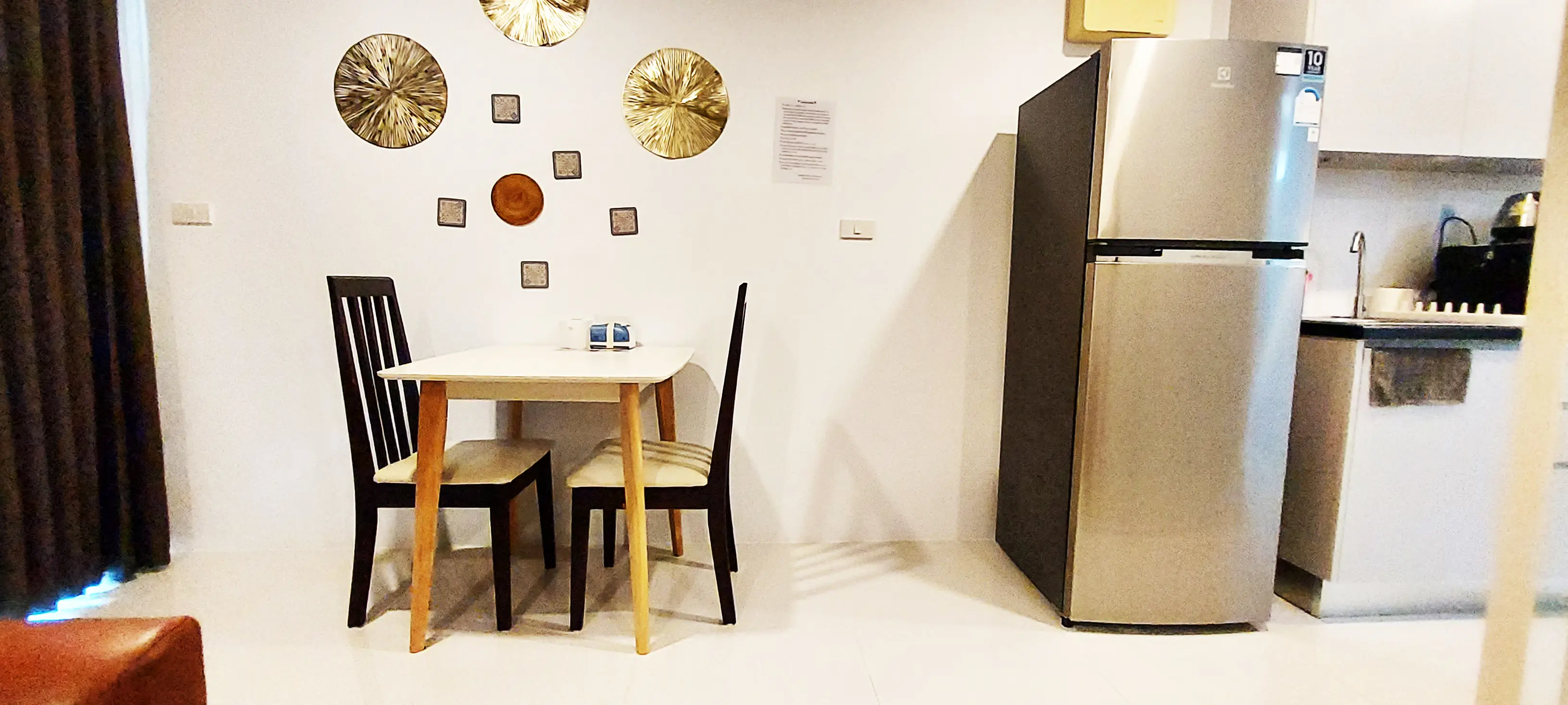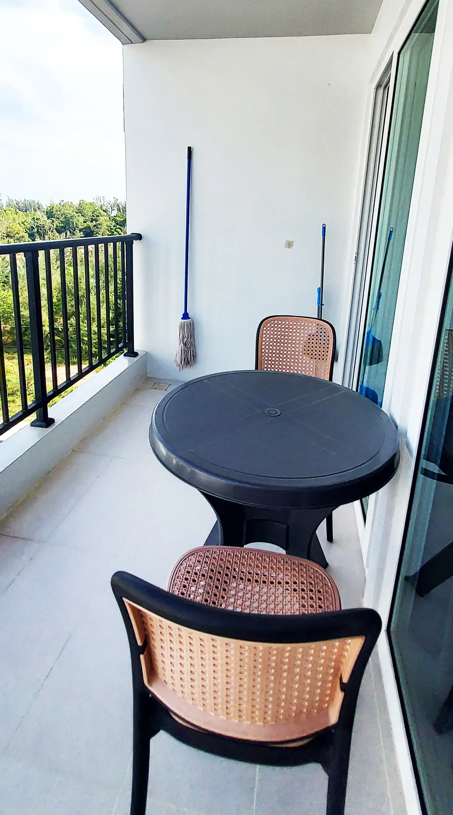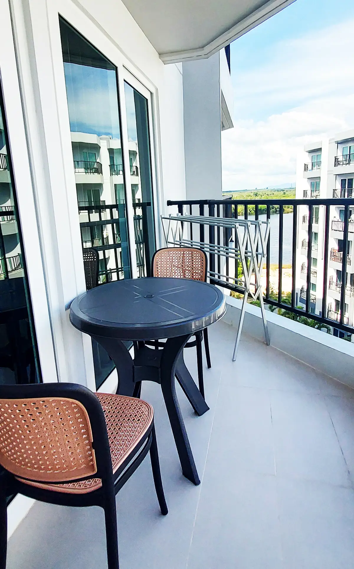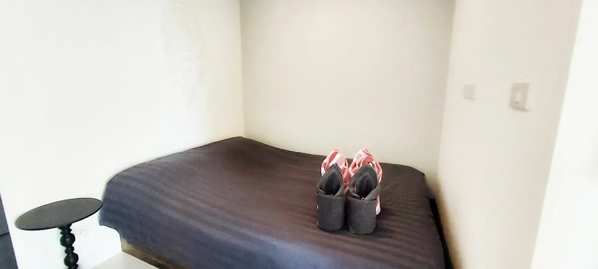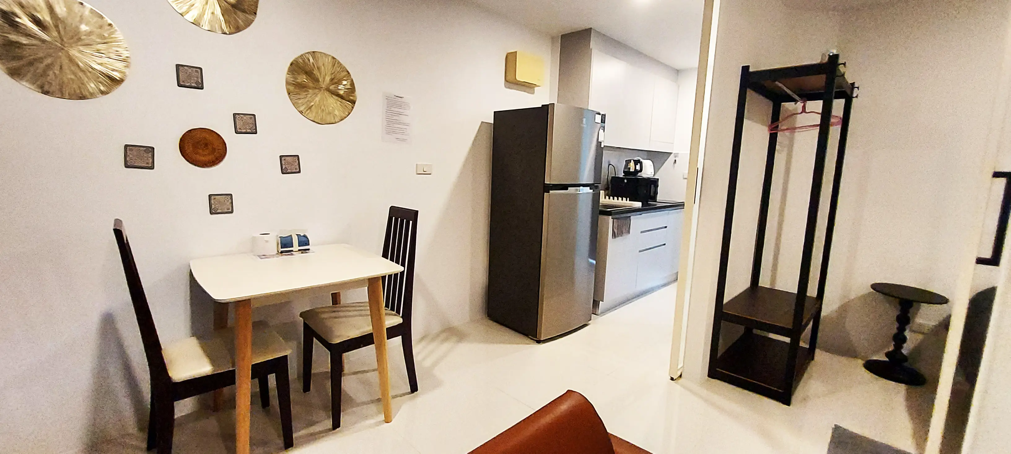 This condo on floor 7 has a living area of 32.32 square meters with a bedroom, a fully tiled bathroom, a living room and a kitchen area. The bedroom has two sliding walls/doors. Both the bedroom and the living room have air conditioning.