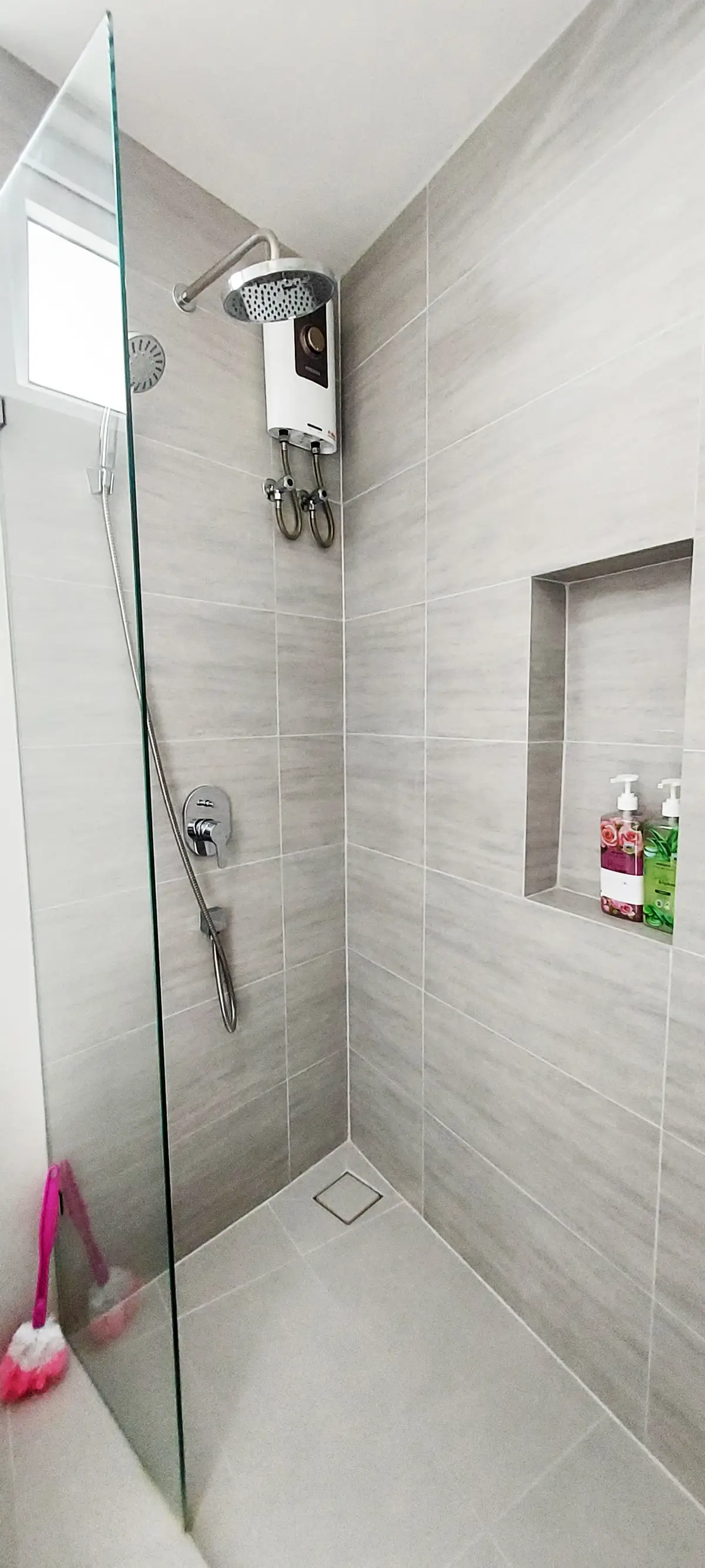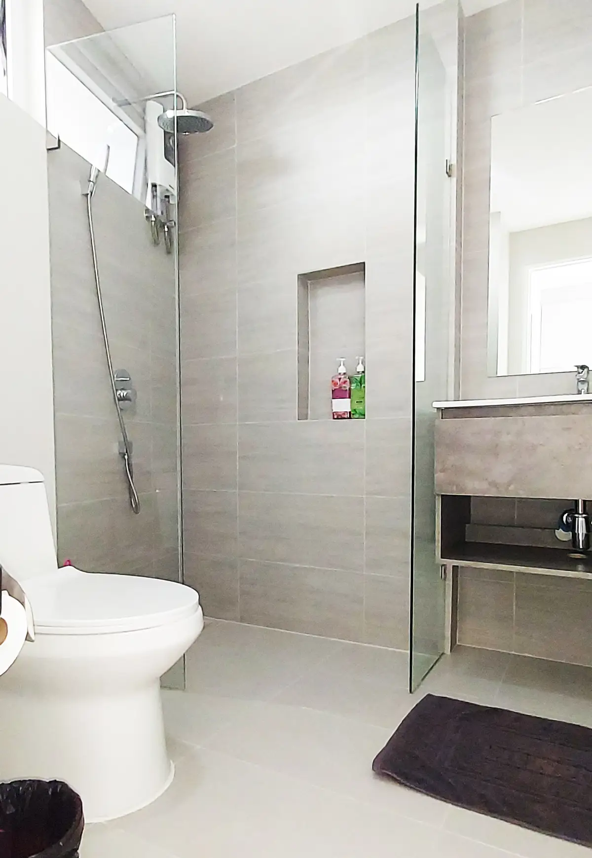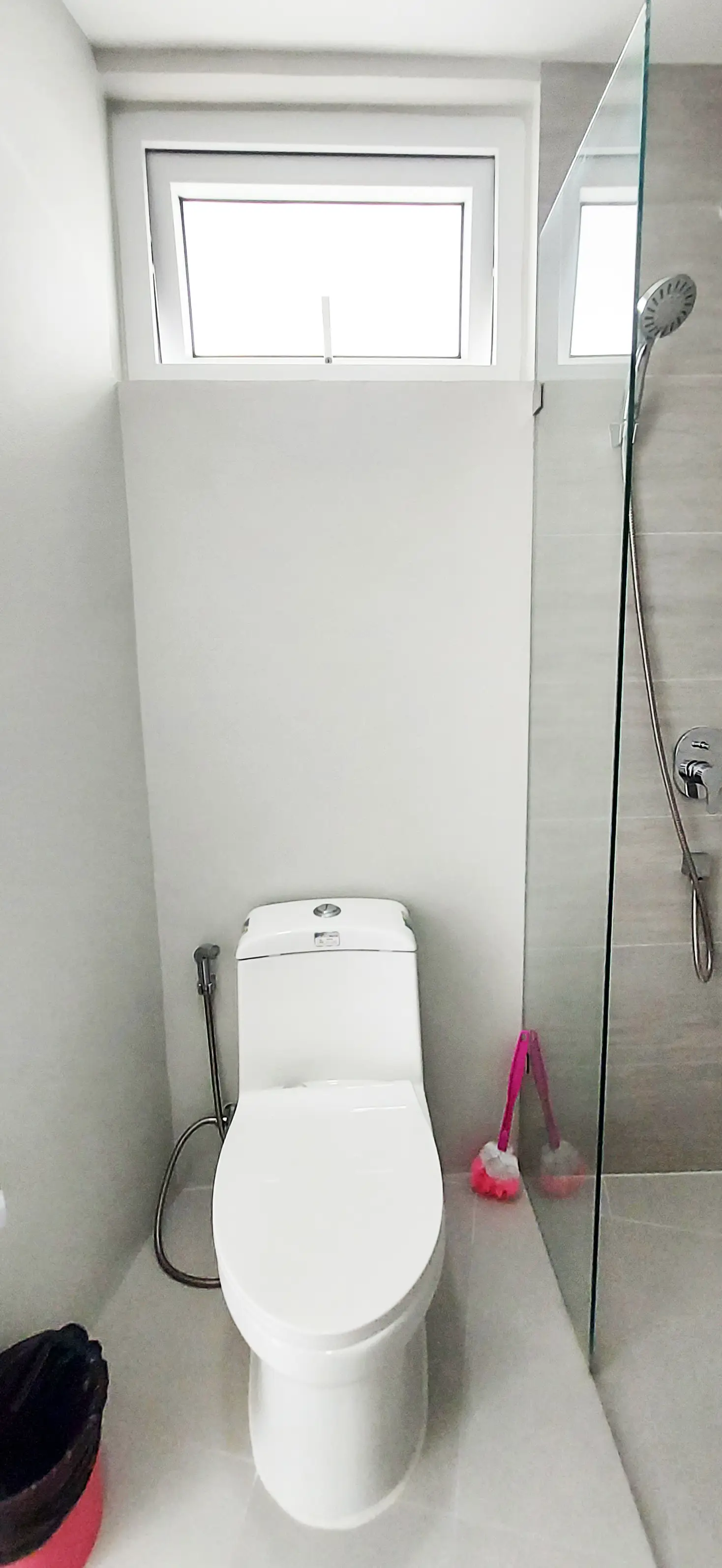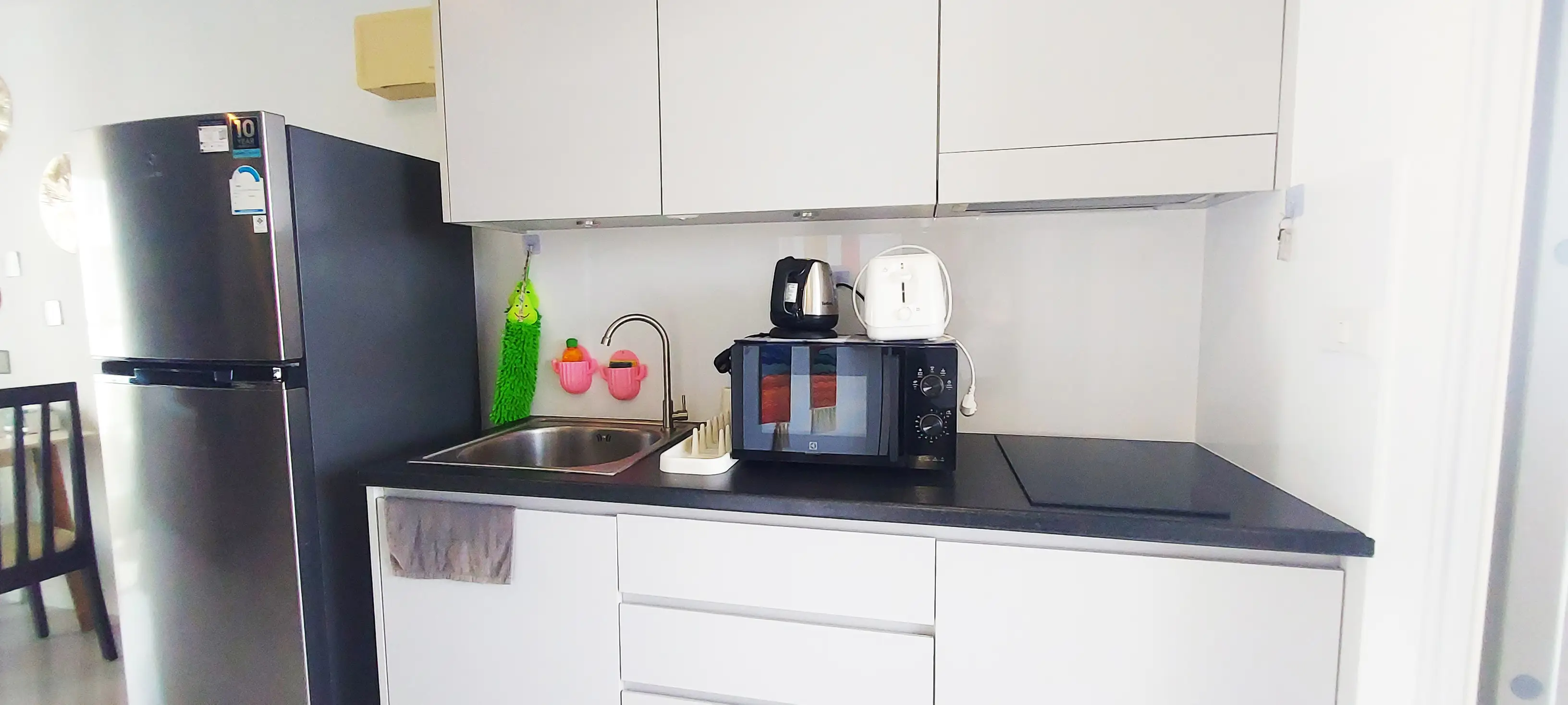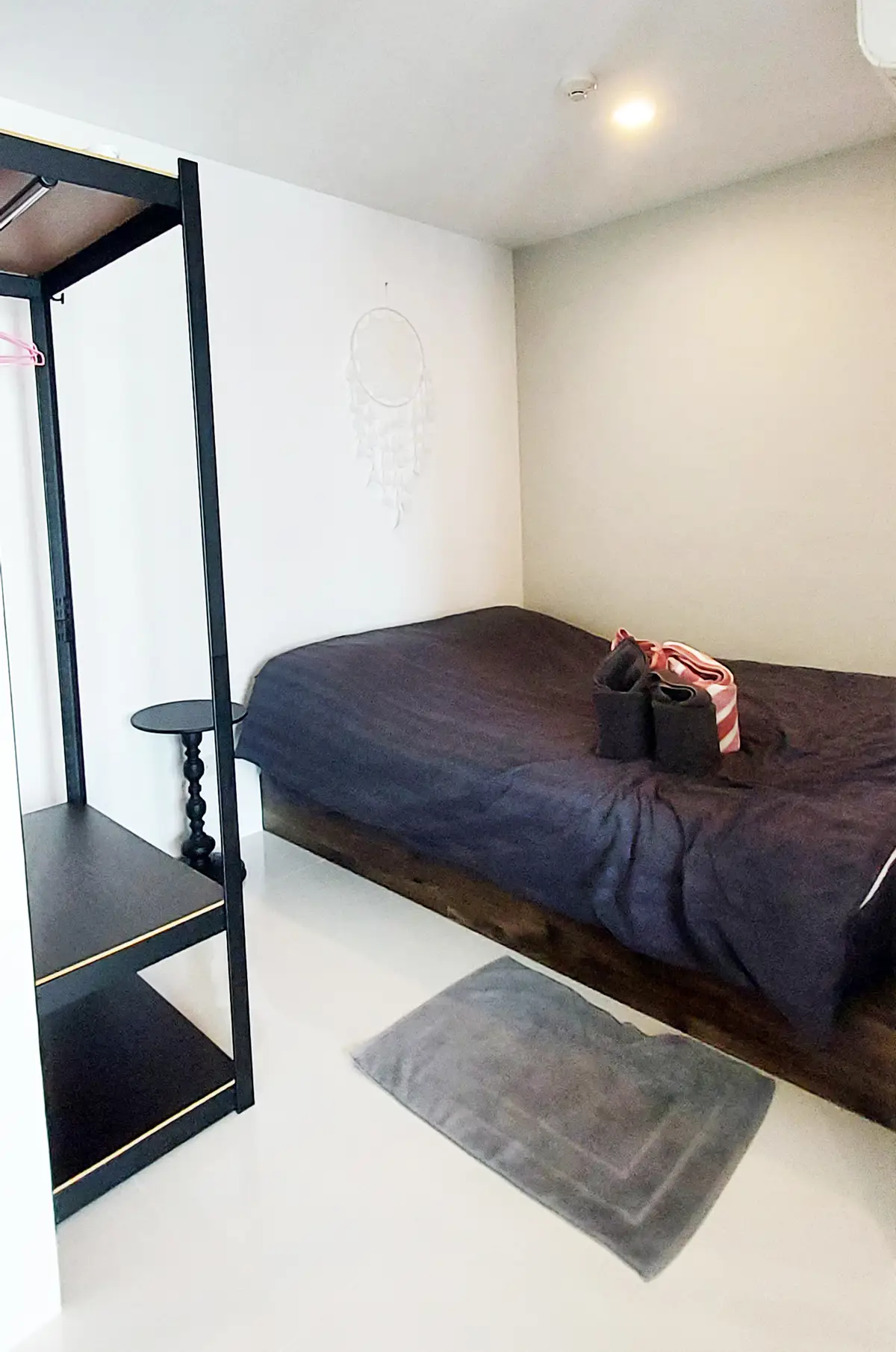 This condo on floor 7 has a living area of 32.32 square meters with a bedroom, a fully tiled bathroom, a living room and a kitchen area. The bedroom has two sliding walls/doors. Both the bedroom and the living room have air conditioning.