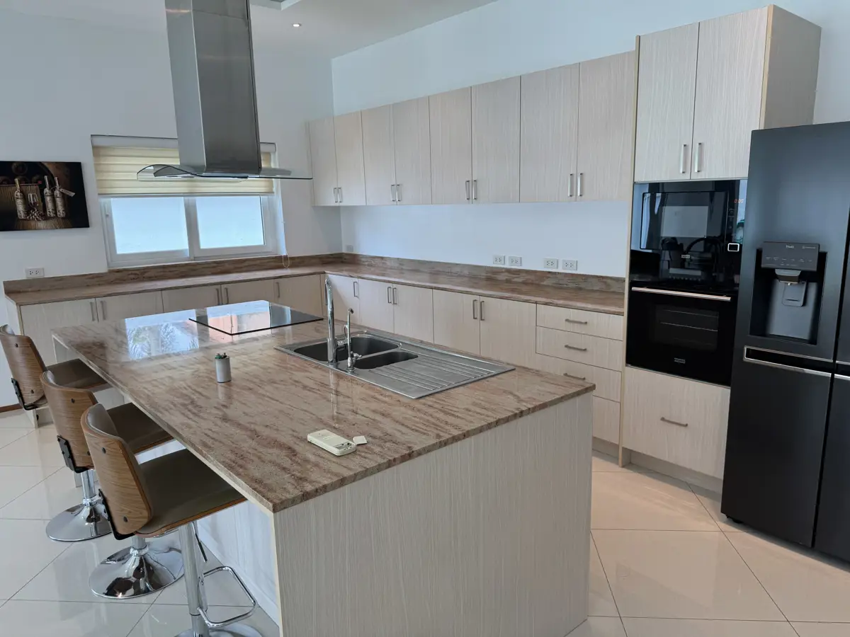 - European kitchen with ceramic hob, oven, microwave, extractor fan, granite countertops, and breakfast island