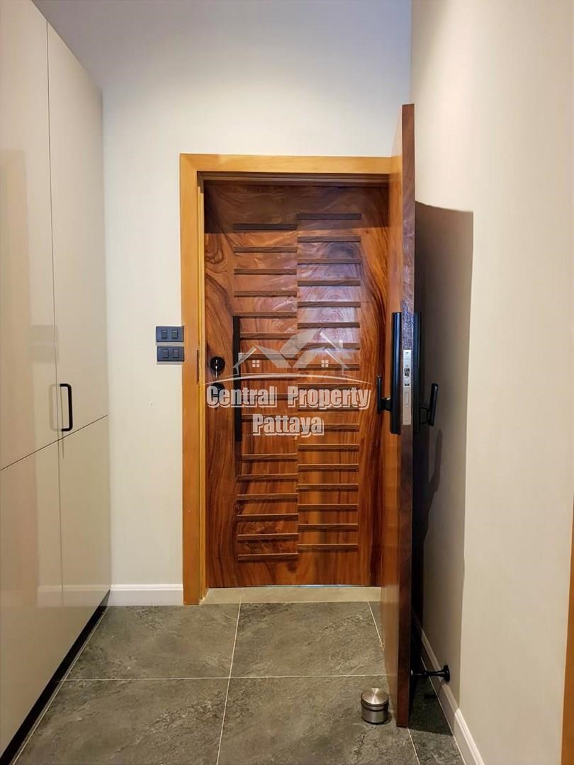 The residence showcases elegant interiors with 3.5-meter-high ceilings, creating an airy and expansive atmosphere complemented by natural wooden accents. The open-plan living area is tastefully furnished, featuring a large flat-screen TV and seamless access to a spacious private terrace. From here, enjoy sweeping views of lush greenery and the resort-style pool — an ideal space for relaxation or entertaining, complete with an outdoor kitchen perfect for al fresco dining.