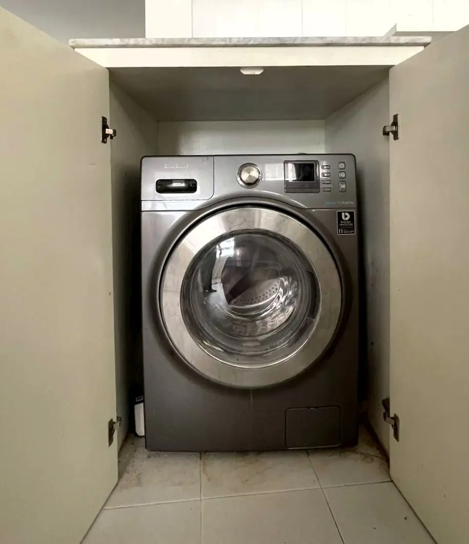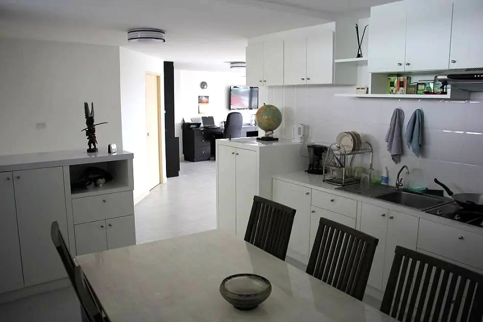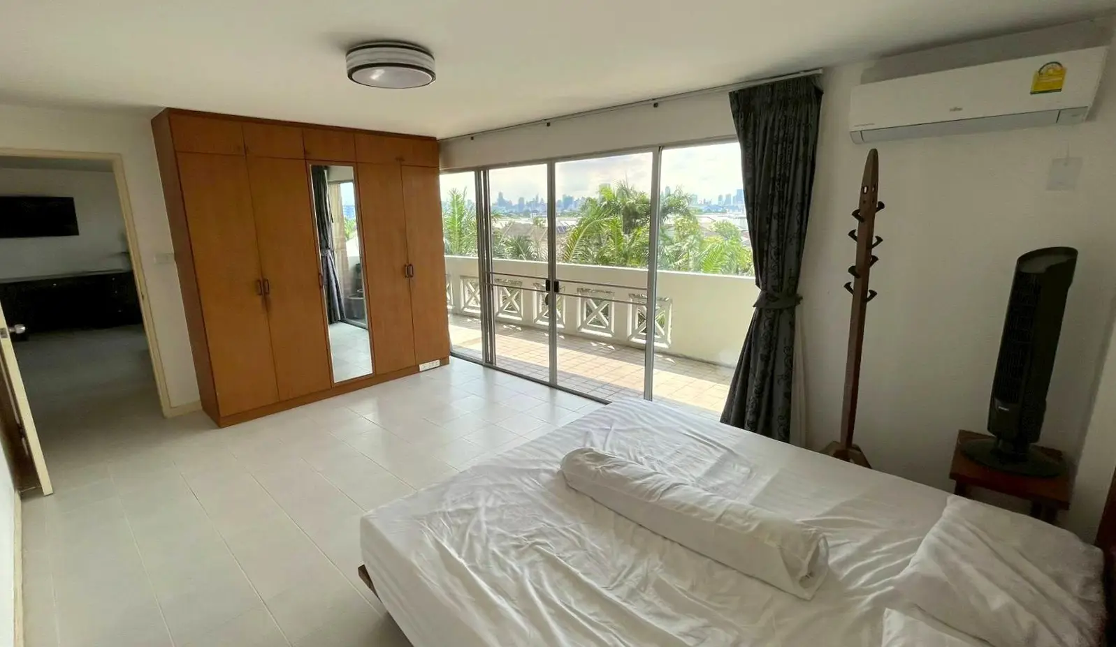 Inside, the condo features a large and airy living room with sliding glass doors that open to a sheltered balcony, inviting plenty of natural light and fresh air. The open-plan kitchen and dining area includes a 4-ring electric stove, a powerful extractor, refrigerator/freezer combo, washer/dryer, air conditioning, generous storage, and a dining table for six.