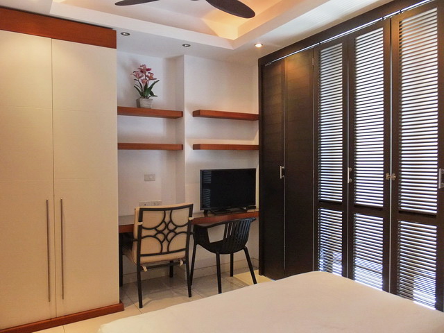 Third bedroom with full bedroom furniture, built-in wardrobes and cabinets, vanity counter and flat screen TV.